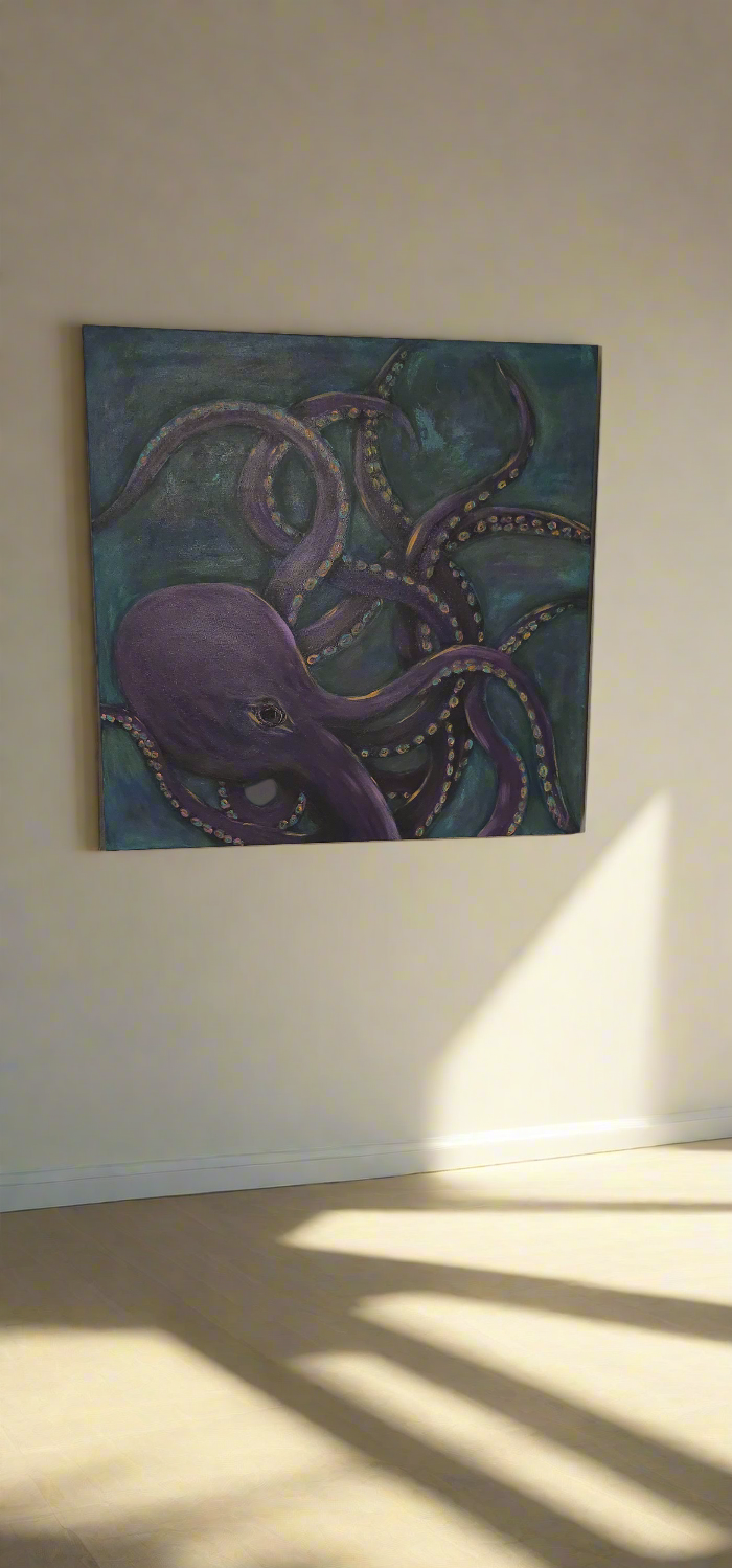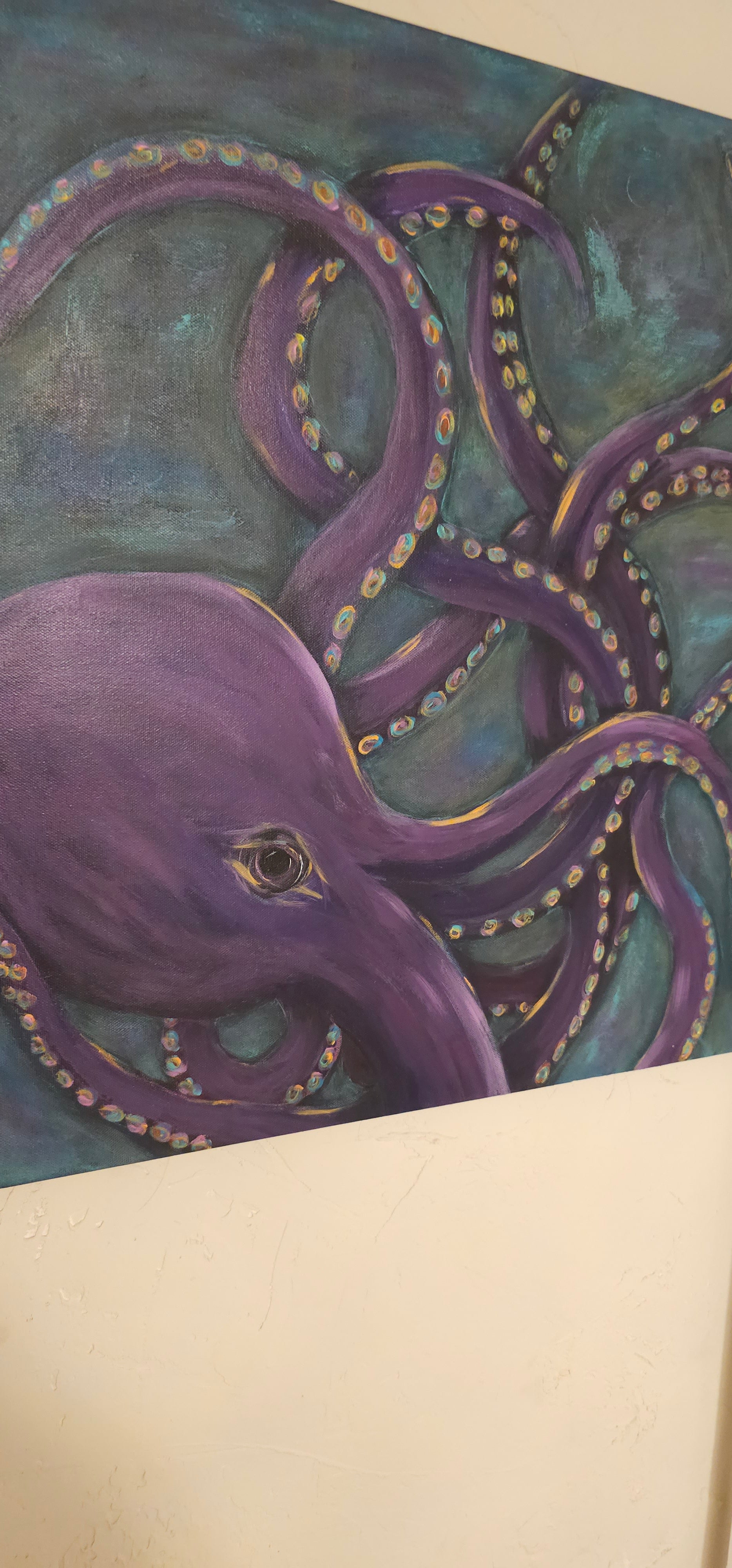24x24 acrylic painting on a 2in gallery wrapped canvas. This colorful stunning deep sea creature would be a perfect addition to your home. Sides are painted black so you can hang as is or add a floater frame.